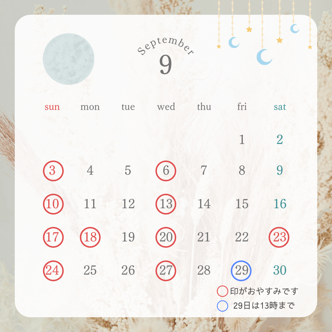 2023年9月の休診日は下記の通りとなります。 ・毎週水、日曜 9/3, 6, 10, 13, 17, 20, 24, 27, ・祝日 9/18 (月),23(土)