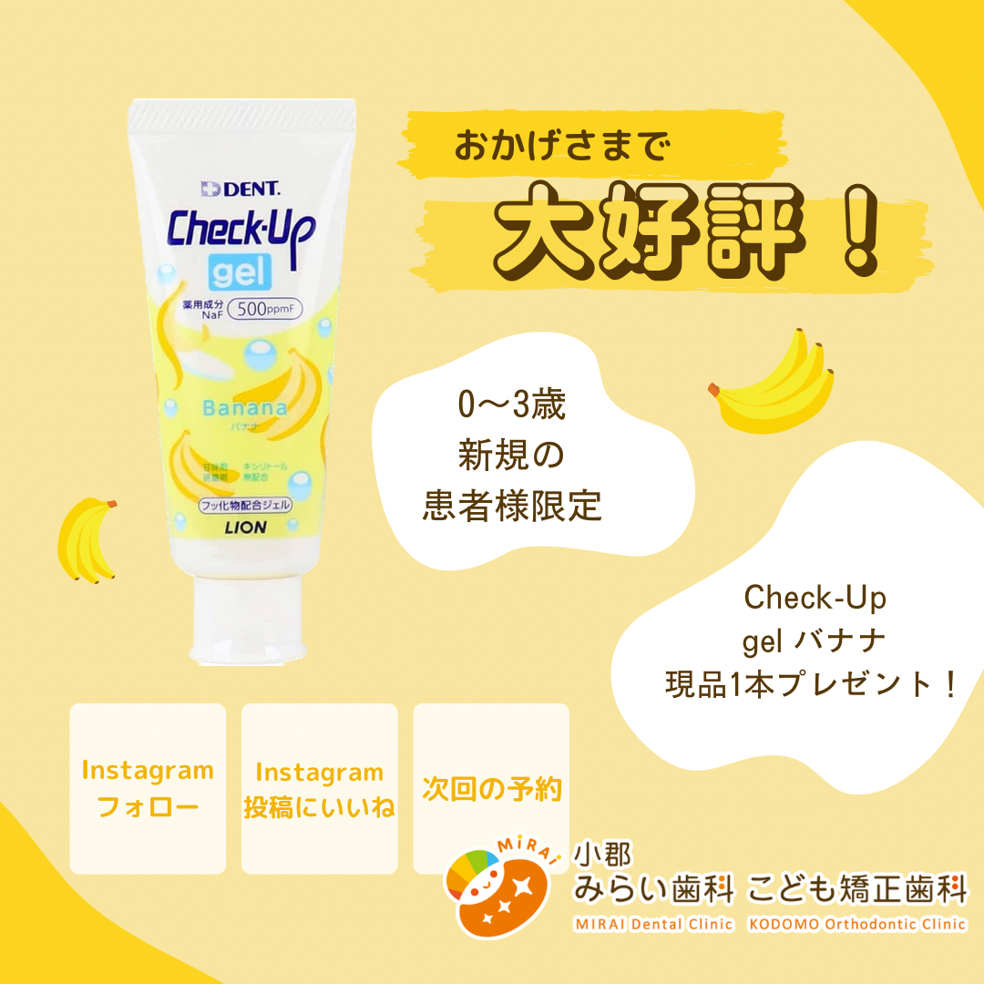 むし歯予防に効果的なチェックアップgelのバナナ味の現品を1本プレゼントいたします🎁✨