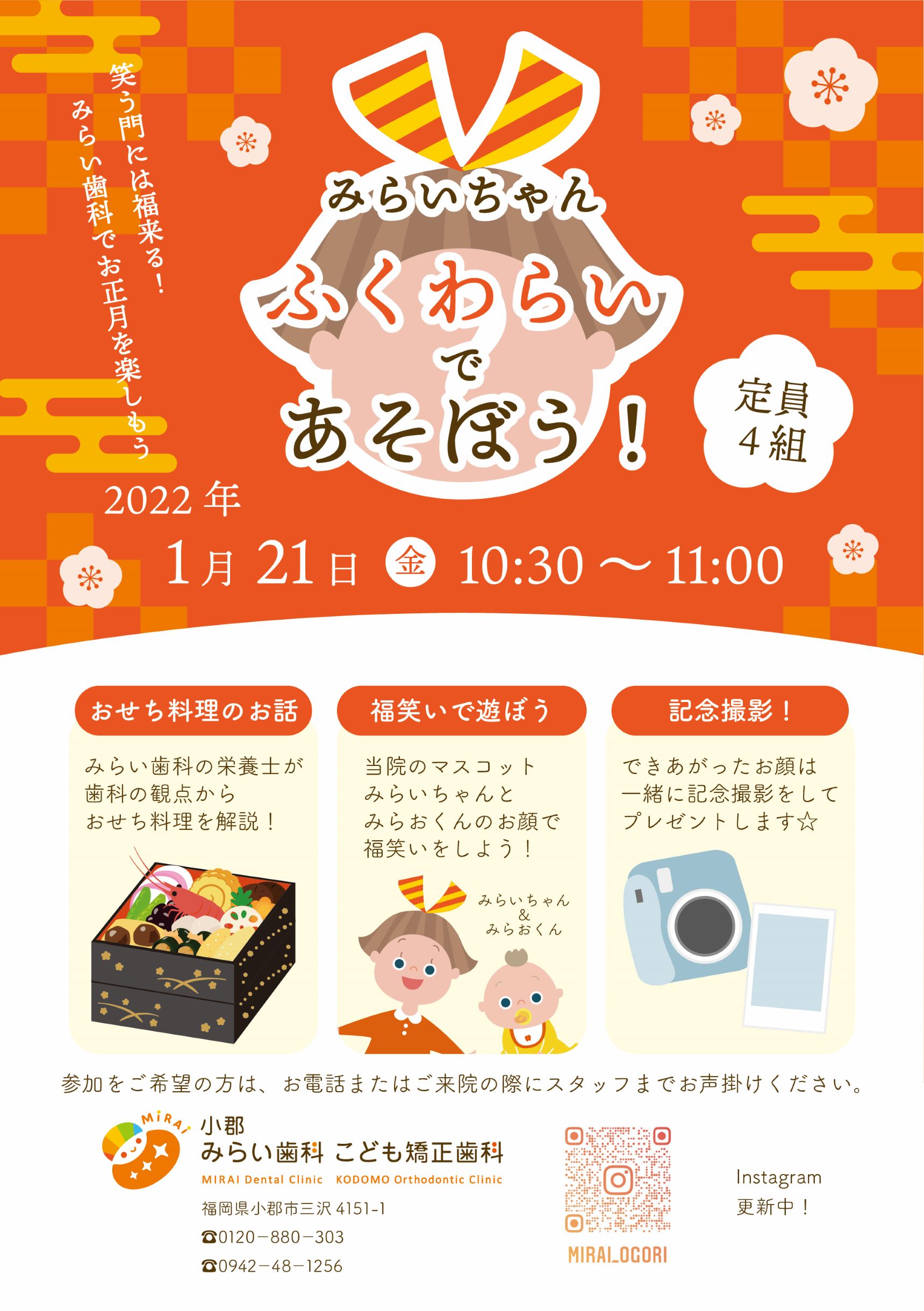 みらい歯科のイメージキャラクターみらいちゃん&みらおくんのふくわらいで一緒に遊びましょう!